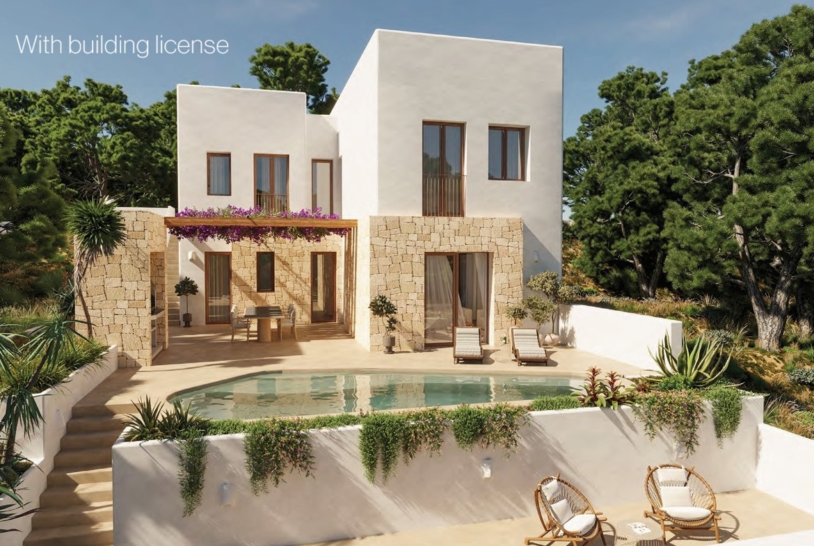 Ibizastijl villa project met bouwvergunning op 950 m van het strand te koop in Benissa,