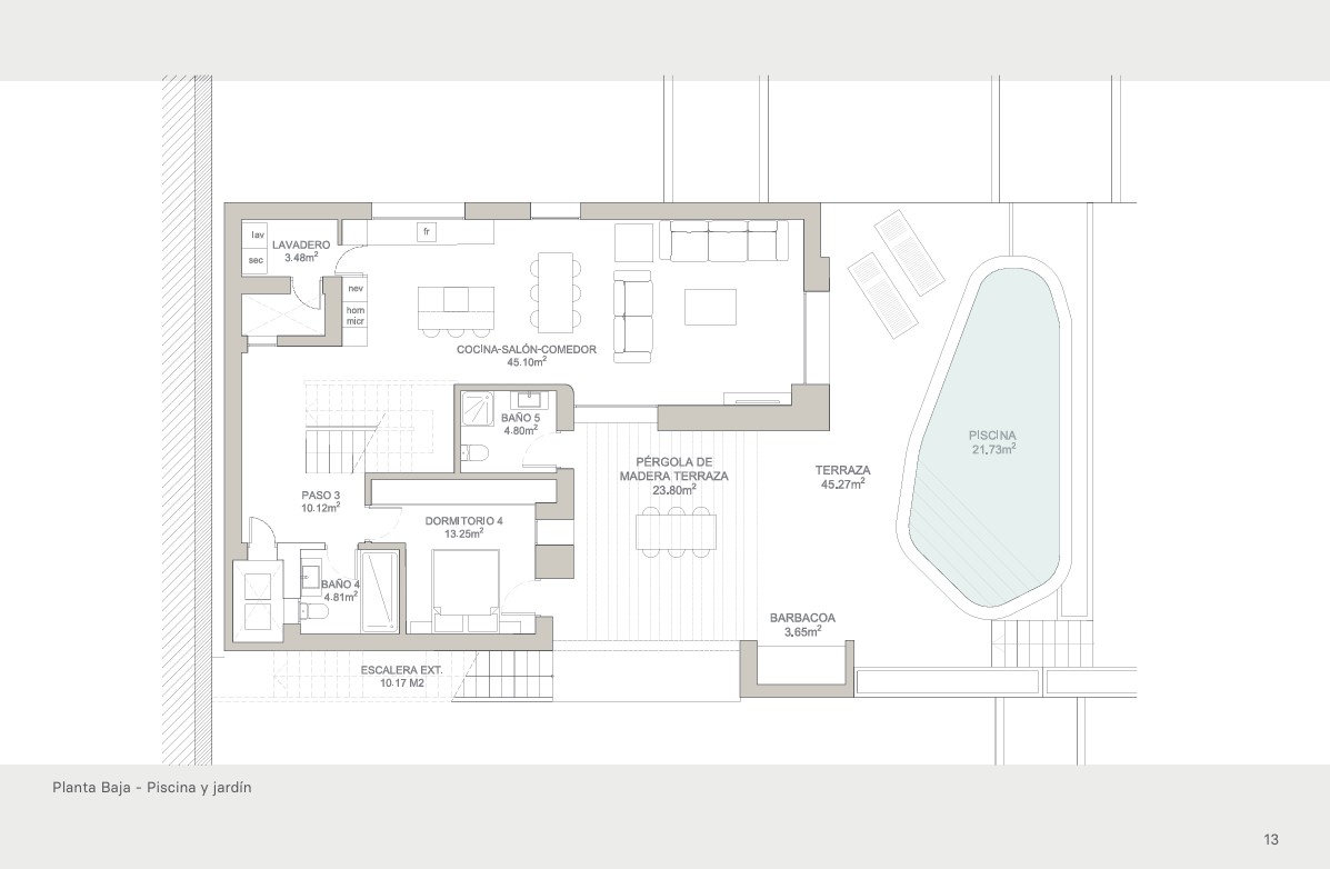Je komt binnen op de bovenverdieping in een ruime hal, op deze verdieping bevinden zich drie ruime tweepersoonsslaapkamers, elk met een en suite badkamer. De benedenverdieping herbergt het woongedeelte, bestaande uit een ruime woon-eetkamer met een open keuken met een kookeiland en een wasruimte. Voor extra comfort is er op deze verdieping nog een vierde slaapkamer met een en ensuite badkamer. Zowel vanuit de woonkamer als vanuit de slaapkamer is er een directe toegang tot het terras aan het zwembad, dat tevens beschikt over een barbecue zone. Daarnaast is de villa ook voorzien van een volledig uitgeruste buitenbadkamer, een opslagruimte en parkeerplaats voor twee wagens. Voor optimaal comfort wordt er zowel airconditioning warm/koud als ook vloerverwarming geïnstalleerd dat bediend kan worden via het AIRZONE systeem.